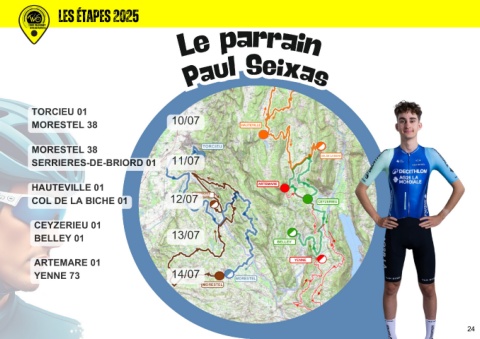 Paul Seixas les étapes 2025 Le parrain Le parrain Paul Seixas TORCIEU 01 10/07 MORESTEL 38 MORESTEL 38 SERRIERES-DE-BRIORD 01 11/07 HAUTEVILLE 01 COL DE LA BICHE 01 12/07 CEYZERIEU 01 BELLEY 01 13/07 ARTEMARE 01 YENNE 73 14/07 24